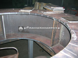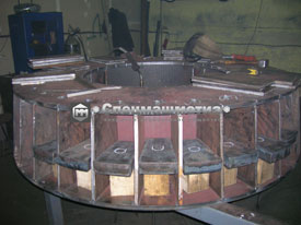 Каждый ростверк представляет собой готовую сварную конструкцию высотой 400мм и диаметром от 1200 до 1800 мм. Нижний и верхний фланцы привариварены к торцам обечайки. Жесткость конструкции обеспечивается несколькими десятками ребер толщиной 16мм. Между ребрами жесткости ввариваются упорные анкерные пластины из листа 50 мм, к которым крепятся шпильки. В связи с большими нагрузками и суровым климатом полуострова Ямал для изготовления будет применен листовой металлопрокат из хладостойкой низколегированной стали 09Г2С толщиной от 16 до 50 мм. Крепеж будет изготовлен из стали 09Г2С-6. Масса каждого ростверка варьируется от 950кг до 2300кг.